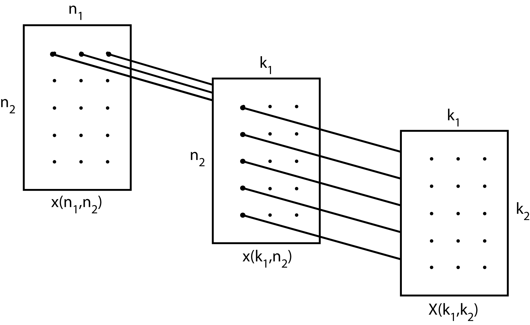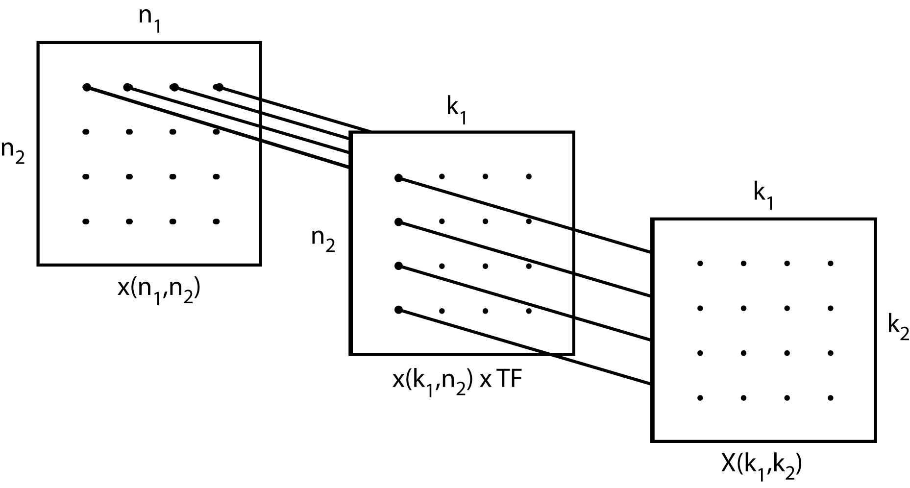 which is similar to Equation 3.22, except that now the type-one map gives a pure two-dimensional DFT calculation with no TFs, and the sums can be done in either order. Figures Figure 3.2 and Figure 3.3 also describe this case but now there are no Twiddle Factor multiplications in the center and the resulting system is called a ``prime factor algorithm" (PFA).