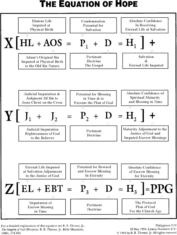 Divine Institutions – The systems created by God for the proper function and protection of the Human Race in the Angelic Conflict to allow a resolution of the Angelic Conflict appeal trail. There are 4 Divine Institutions including, Freedom (Volition), Marriage, Family, and Government each with its own specific area of and structure for function. Divine Viewpoint – Orientation of the Right Lobe of the Stream of Consciousness of the Soul of the believer based on maximum Metabolized Bible Doctrine in the soul. Election – A system of privilege designed by the Integrity of God in Eternity Past relating each believer to the Plan of God through Grace without regard to his status in the Spiritual Life . Enforced Humility – Any system of discipline instilled and based on the proper function of some organizational authority whether it be outside the individual or based on his personal self discipline. Essentials – The absolute truths in life of the gospel of Christ, the Laws of Divine Establishment, and all other Bible Doctrines Equation of Hope – The outline of the Plan of God by R. B. Thieme Jr.