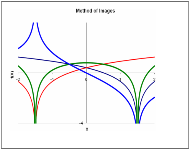 An example of the method of images to satisfy either the Dirichlet or Neumann boundary conditions is illustrated in the following figure. The black curve is the response to a line sink at x=1.5. We desire to have either the function or the derivative at x=0 to vanish. The red curve is a line sink at x=–1.5. The sum of the two functions is symmetric about x=0 and has zero derivative there. The difference is anti-symmetric about x=0 and vanishes at x=0.