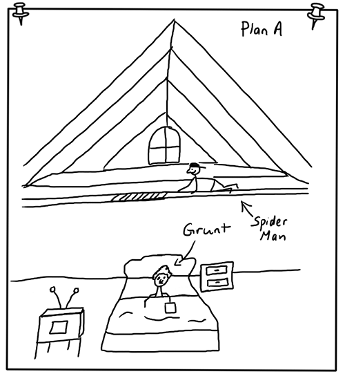 A few days had passed since the camping trip and William was anxious to pull off another prank. This time around it was going to be a very simple and straightforward one. William’s grandma was still at his house and had a terrible fear of spiders. (Why William had to torment her, I had no idea, but he seemed to enjoy it.) While at school, William traded a kid in our class his Whoopee Cushion (which he used to prank Mr. Mousseau) for a giant fake spider. He said the idea came to him during class while Mr. Mousseau was teaching a science lesson and talked about people who had arachnophobia. Arachnophobia is the fear of spiders, and his grandma was deathly afraid of them. William thought it would be a great trick to scare his poor grandmother when she was in her bed reading for the night. He explained that there was an old heating vent that wasn’t used anymore above the bed and that it was covered by a wooden box and some insulation in the attic. William said he would carefully crawl across the floor joists and quietly remove everything so he could lower the fake spider down through the vent with some fishing line. His grandma would be reading as usual and he would lower the spider down until it was just above her head. It would then be only a matter of time before she spotted the spider and freaked out. He was sad to know that he would miss seeing her face as she screamed at the sight of the spider. He had written the plans in class and had them ready for me to see. The first plan showed William crawling through the attic above his grandma as she was reading in bed.